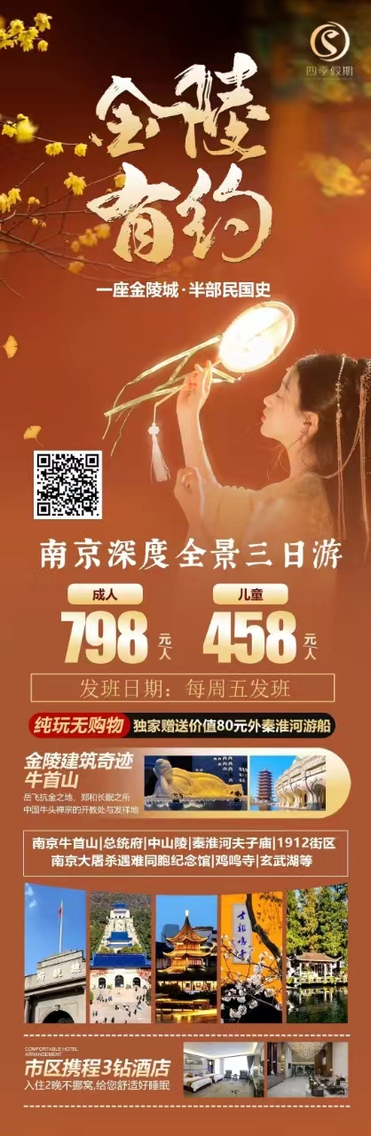 早餐后参观【中山陵】(游览时间1.5小时)包括博爱坊、墓道、陵门、碑亭、祭堂和墓室等建筑。中山陵是孙中山的陵墓,陵墓的入口有孙中山手书的“博爱”两个金字。整个建筑群依山势而建,由南往北排列在一条中轴线上,墓地全局呈“警钟”形图案。后游览中国近代史博物馆【总统府】(游览时间1.5小时)南京总统府位于南京市玄武区长江路292号,是中国近代建筑遗存中规模最大、保存最完整的建筑群,也是南京民国建筑的主要代表之一,现已辟为中国近代史遗址博物馆。1912年1月1日,孙中山在此宣誓就职中华民国临时大总统,辟为大总统府,后来又为南京国民政府总统府。南京总统府自近代以来,多次成为中国政治军事的中枢、重大事件的策源地,现已列为全国重点文物保护单位,国家AAAA级旅游景区。后游览【南京1912】南京1912又称南京1912街区,位于南京市玄武区,东邻南京总统府、西至太平北路、南至长江路、北至长江后街,是南京地区以民国文化为建筑特点的商业建筑群,也是南京民国建筑和城市旧建筑保护与开发的成功案例,是由19幢民国风格建筑及共和、博爱、新世纪、太平洋4个街心广场组成的时尚商业休闲街区。后赠送乘坐【外秦淮河画舫】(船票,已含)游外秦淮河。秦淮河有内秦淮河、外秦淮河之分,内秦淮河指夫子庙一带,外秦淮河指石头城公园一带。深入到街巷中或是泛舟秦淮河,从不同视角感受河畔风土人情。外秦淮河由通济门经中华门绕行南城外的东、南、西三面,流经中华门外,过汉中门,草场门、定淮门,循石头城北流至三汊河入长江。根据文献记载,秦淮河曾名“小江”,应是与长江这“大江”相对而言。三国时期,孙权曾对刘备说:“秣陵有小江百余里,可以安大船,吾方理水军,当移据之。”这里的“小江”就是指秦淮河。“淮水”是汉到隋时的通称。到唐代才称“秦淮河”,因相传秦始皇东巡时,望金陵上空紫气升腾,以为王气,下令在今南京市区东南方山一带,凿断连岗,导龙藏浦北入长江,所以才称此水为“秦淮”。后游览【鸡鸣寺】(1个半小时),距今已有1700多年历史,自古有“南朝第一寺”、“南朝四百八十寺之首”的美誉,也是电视剧《新白娘子传奇》的拍摄地。之后前往游览金陵四十八景之一的【玄武湖】(游览时间1.5小时),此湖位于南京城北,为南京著名的旅游景点,明代时期是朱元璋的黄册库,清朝为召开南洋劝业会开放,湖内有五座小岛,环湖烟柳为金陵四十八景之一,湖边环绕南京明代的古城墙。春天的湖边烟柳环绕,樱州之上樱花烂漫,海棠盛开,漫步其中,让人陶醉,游人泛舟湖上,春意黯然。 |